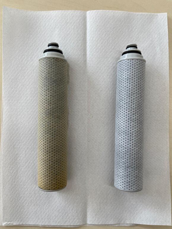 写真をご覧ください。実際に当社で使用したものです。左が使用済み、右が未使用の浄水器フィルターです。